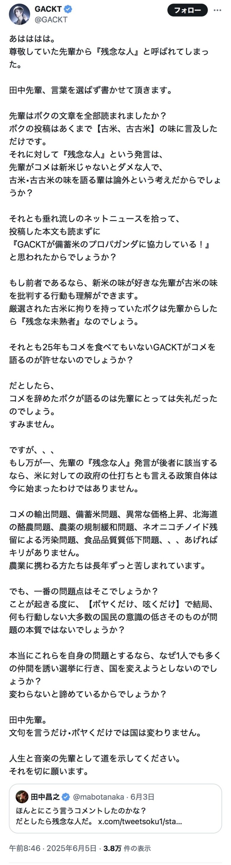 それに対して『残念な人』という発言は、… https://t.co/aT9ilTWBcE— GACKT (@GACKT) June 4, 2025