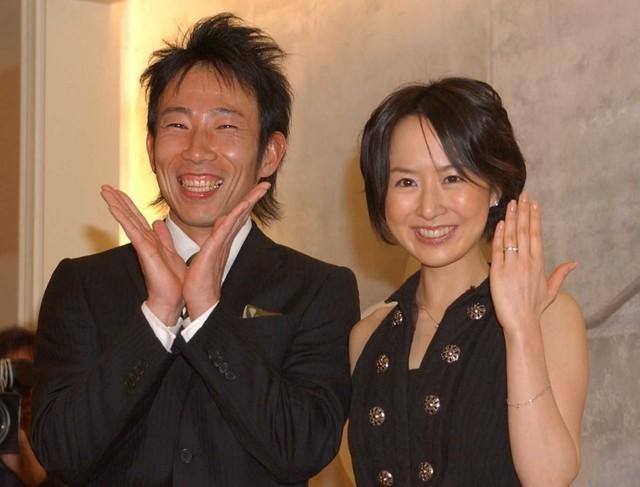 結婚会見で持ちギャグ「うれCY!」を披露するモンキッキー(現おさる)と、婚約指輪を披露する山川恵里佳=2007年