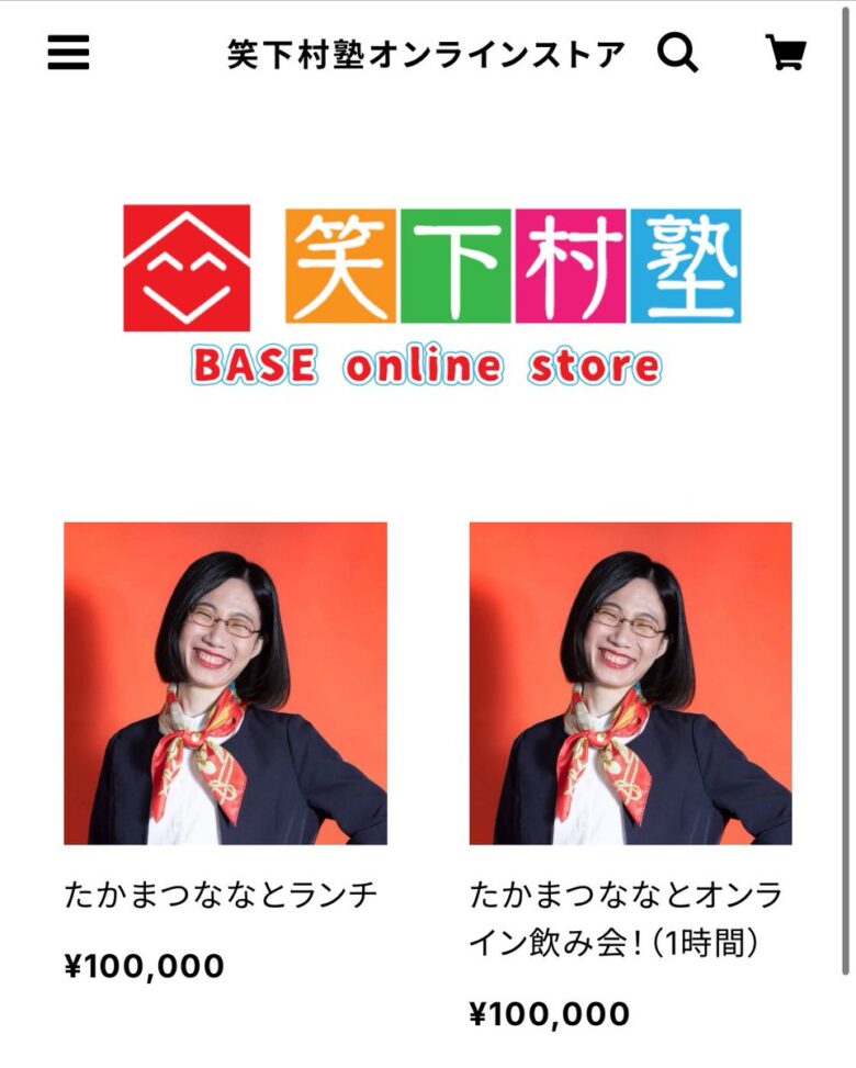 投稿には、BASE上で販売されている商品画像も添えられており、「たかまつななとランチ」「たかまつななとオンライン飲み会(1時間)」のいずれも価格は10万円でした。