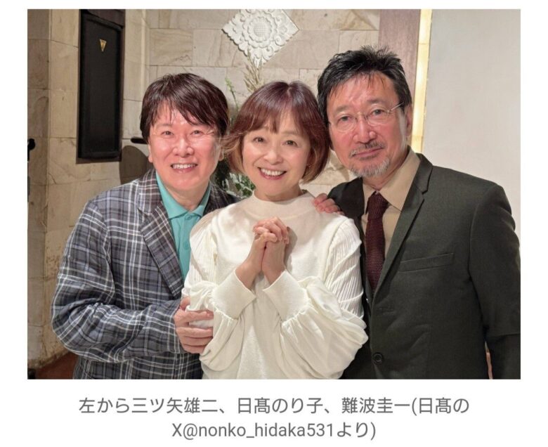 「久しぶりの3ショット!」と紹介し、同じく声優の三ツ矢雄二、難波圭一と並ぶ一枚を投稿した。 浅倉南(日髙)を挟んで、双子の兄弟である上杉達也(三ツ矢)、和也(難波)が顔を揃えている。