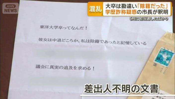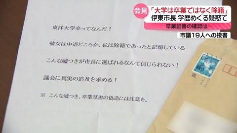 伊東市長が「東洋大学卒」と広報に掲載→実は除籍と判明。卒業証明を「チラ見せ」するも詳細不明で偽造疑惑も浮上。