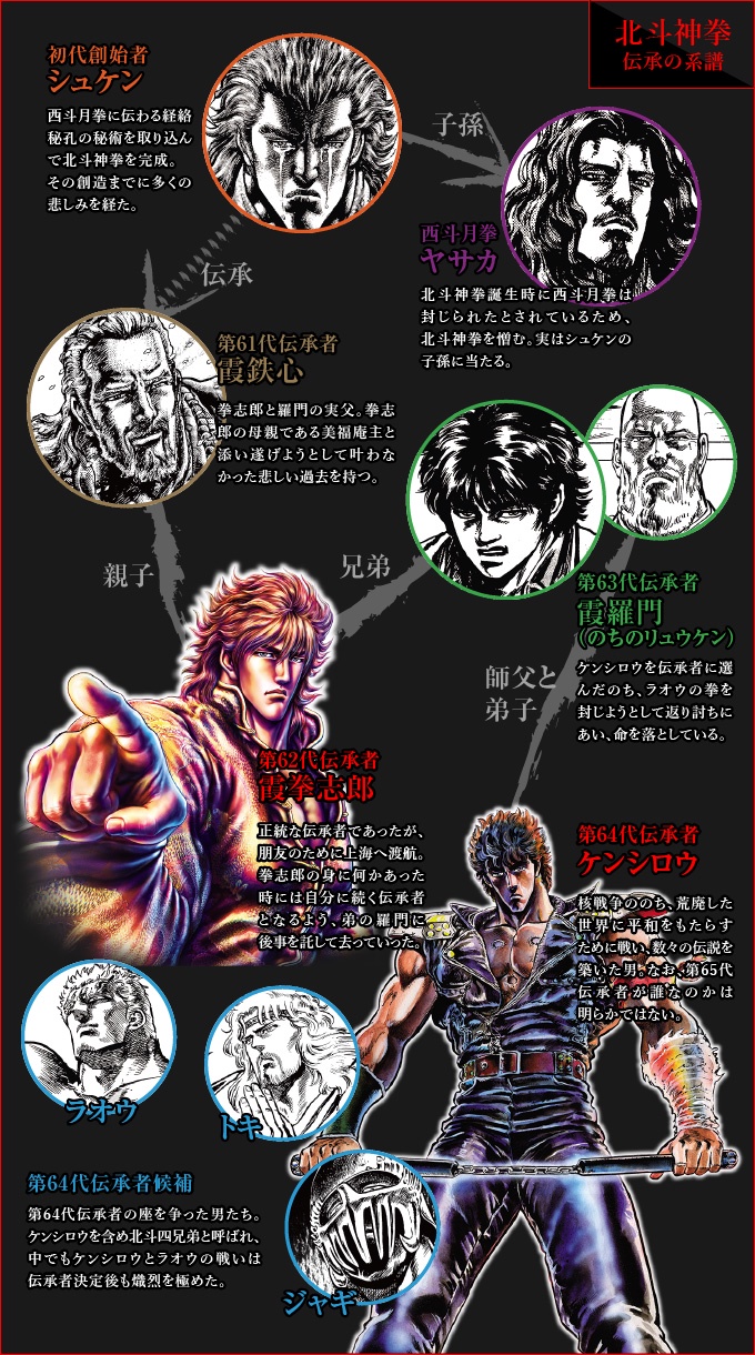 霞拳志郎(62代目)、リュウケンこと霞羅門(63代目)、ケンシロウ(64代目)