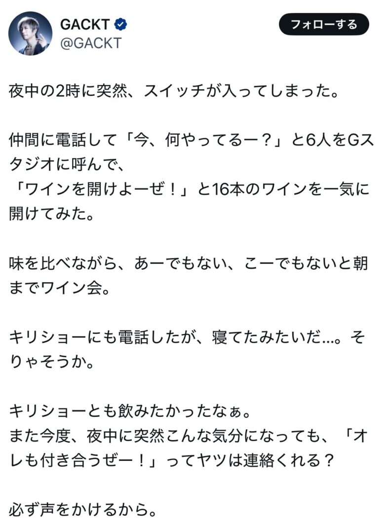 GACKTが深夜2時に仲間6人を呼び出し、朝まで16本のワインを開ける飲み会を開催。鬼龍院翔は寝ていて参加できず。
