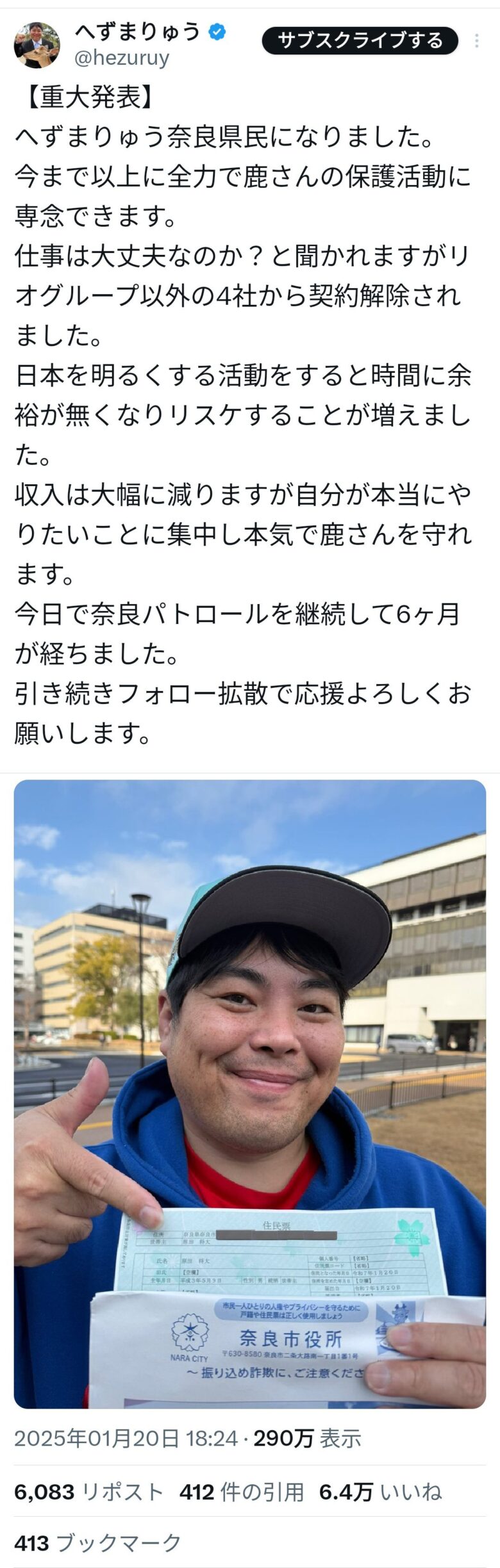 へずまは「選挙目的で最初、(奈良に)来たわけではない」と強調した。「奈良公園の鹿さんが攻撃される…外国人に殴られる蹴られるっていうのを何度もお聞きして動画を撮って、XとかSNSで上げているんですけど、管轄の県議会議員が動いてくれなかった。自分が議員になって誰よりも行動して、動いていけば皆さんにもっともっと信用してもらえるんじゃないかと思い、今回の立候補をさせてもらいました」と、奈良市議選に出馬した動機を語った。