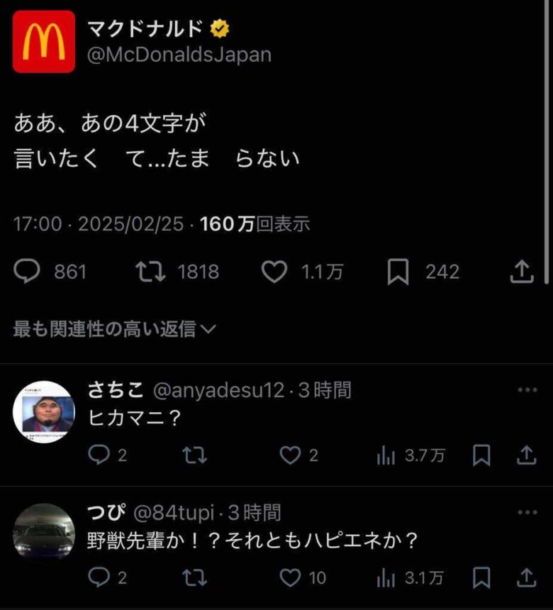 マクドナルド公式が「言いたくてたまらない“4文字”」を投稿し話題に。ネット民が大喜利状態に突入。