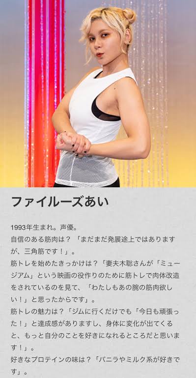 ファイルーズあい:私、筋トレを始めてみたら、めちゃくちゃ楽しいし、すっきりするし。自分に自信がついて、人に嫉妬しなくなったし、積極的にもなって。「努力は裏切らない」っていう教訓を筋肉から学びました。筋トレ頑張ってる人ってホントに輝いてるんですよね。