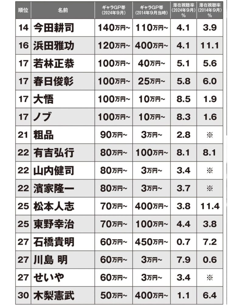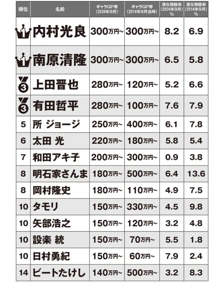 他のコンビが両方リストに載っている中で、爆笑問題の田中が圏外なのが面白い
