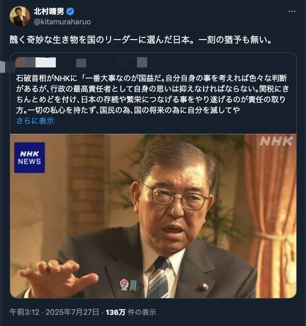 参議院議員選挙(7月20日投開票)に日本保守党から出馬し、初当選した北村晴男氏のXが7月27日、更新され、「醜く奇妙な生き物を国のリーダーに選んだ日本」という文言が投稿された。