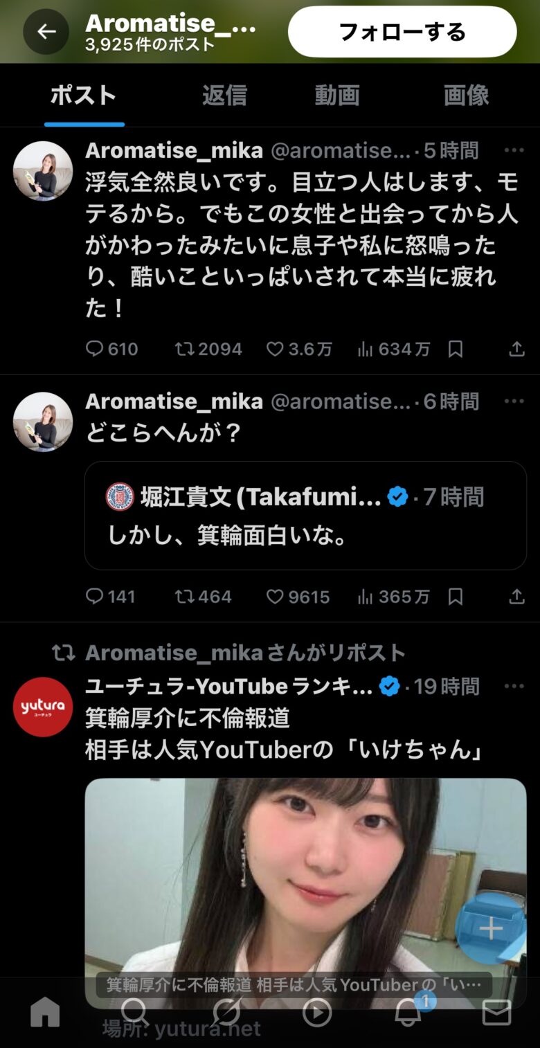 「箕輪さんと一緒にいた女性は、チャンネル登録者数77万人超、SNSの総フォロワー数は200万人以上の旅行系YouTuber、いけちゃんです。Eカップのバストで、グラビアでも人気を博している27歳。一方で一級建築士の資格を持ち、母校や青年会議所で講演をおこなうなど、Z世代への知名度を生かしたイベントに引っ張りだこです。現在は、地元・秋田の東成瀬村との2拠点生活を公表しています」(芸能記者)