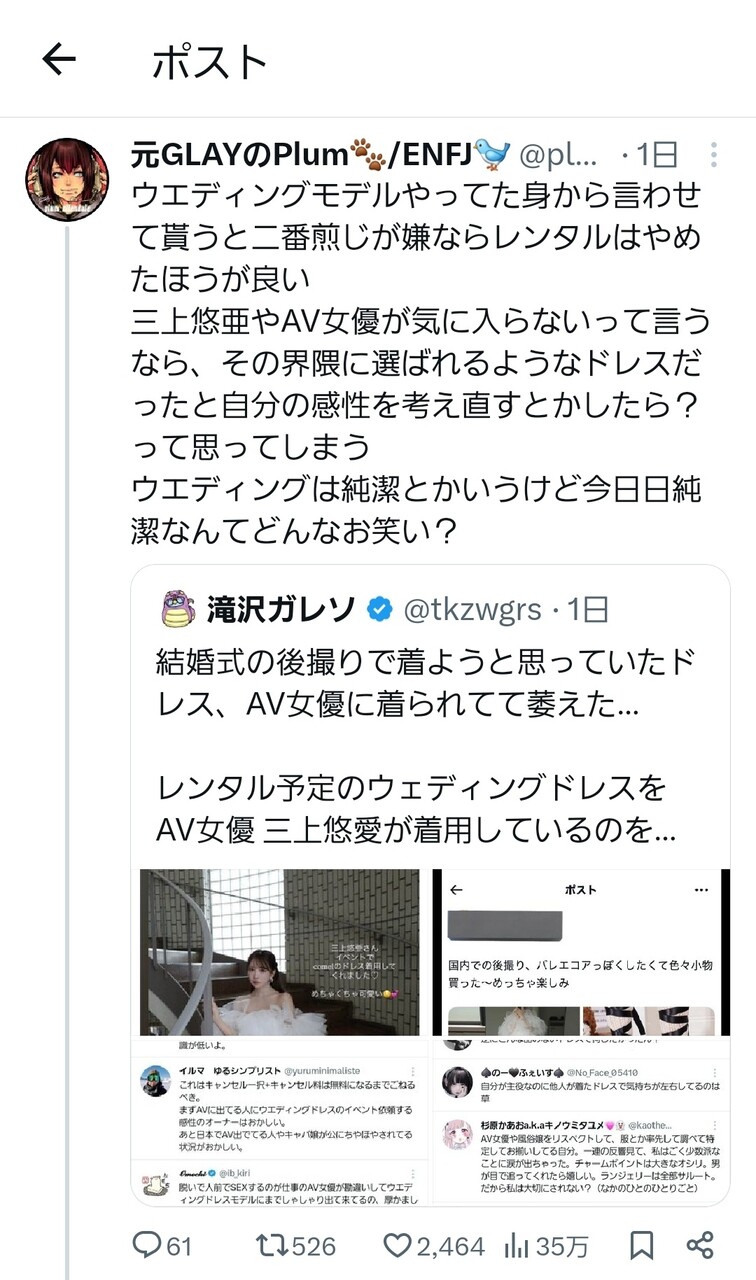 AV女優が着たドレスを巡る差別発言に「妻がAV出ても構わない人だけ文句言え」と反論が飛び交い、議論白熱。