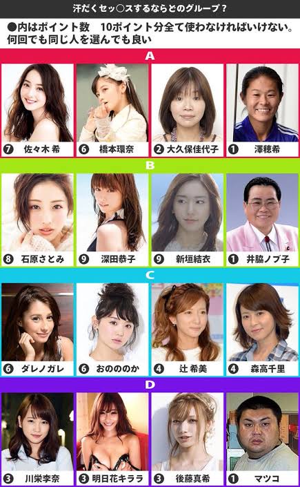 令和最新版の「汗だくSEXグループ表」を紹介。A〜Dまでの選択肢にネット民の意見が飛び交い、人気キャラや回数論争で盛り上がるスレまとめ。