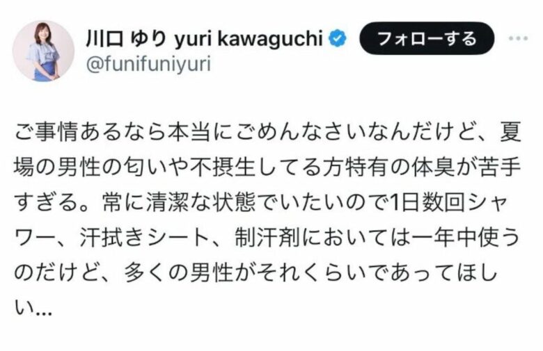 川口は昨年8月、Xで「男性顧客向けの美容事業をますます頑張りたいな」と美容事業にも携わる身としての意気込みを示す中で、「夏場の男性の匂いや不摂生してる方特有の体臭が苦手すぎる」「常に清潔な状態でいたいので1日数回シャワー、汗拭きシート、制汗剤においては一年中使うのだけど、多くの男性がそれくらいであってほしい…」と本音を吐露し、賛否両論を巻き起こしていた。