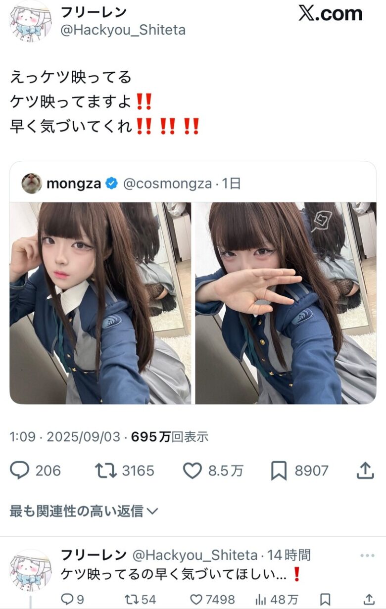 コスプレイヤーがうっかり凡ミスで下着チラリ。掲示板では「えっち」「わざとだろ」と大盛り上がり。