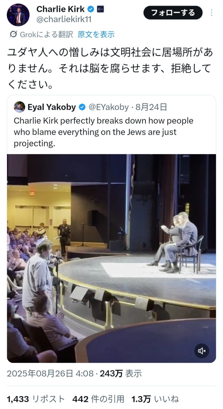 チャーリーカークの動画見たらキリストの教えで世界統一するのが目的言うてる