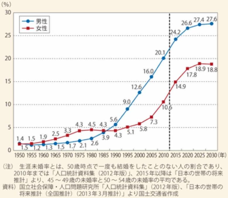 >興味深いことに、生涯未婚率は男女ともに2040年で最高値となったのち、