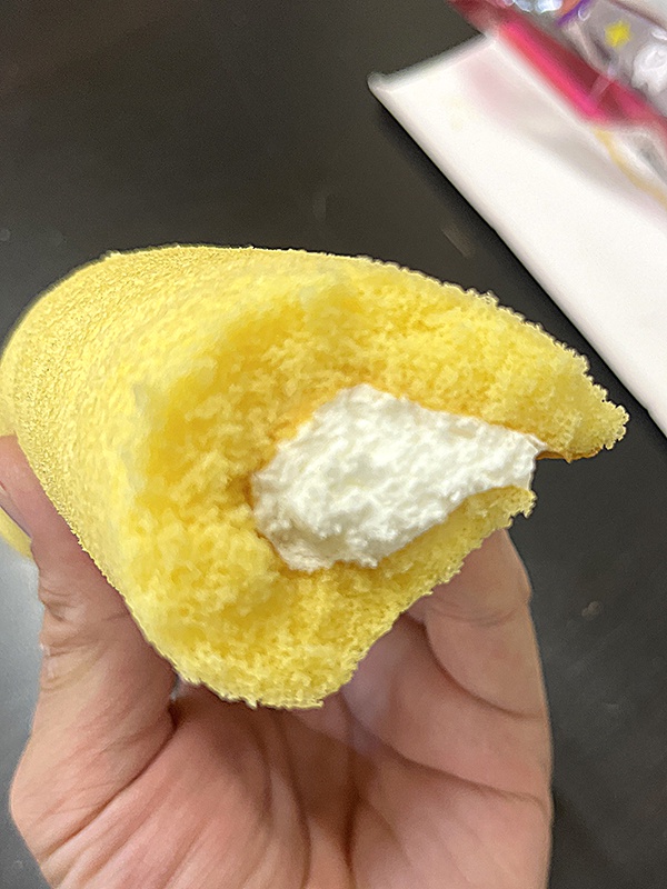 滑らかで軽めのクリームがふわふわなたまご風味の生地に包まれてる
