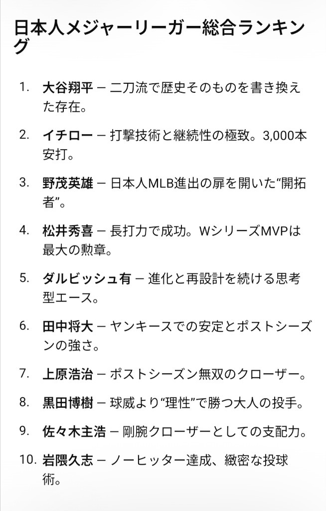 通算3089安打、10年連続200安打。2001年MVP・新人王・首位打者。MLB進出の象徴で、打撃の精密さと守備・走塁のトータル貢献が圧倒的。史上最高の日本人選手として不動。