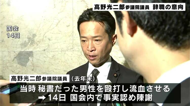 | 秘書の顔を殴り鼻血 自民・高野参院議員が辞職を表明 会見では質問には答えず… …血を出させた問題で、自民党の高野光二郎参議院議員が責任をとるために参議院議員を辞職すると表明しました。 自民党 高野光二郎議員 「私が…暴行してしまい… (出典:(出典:日テレNEWS)) |