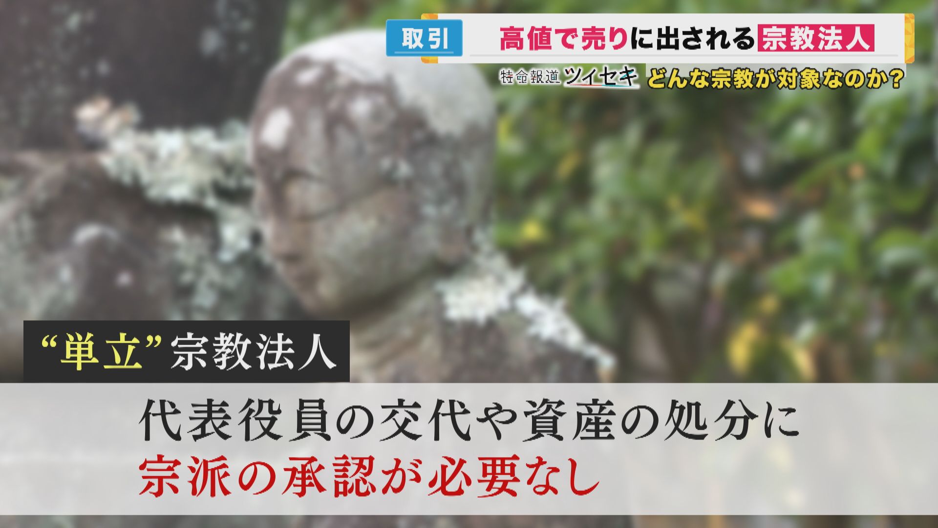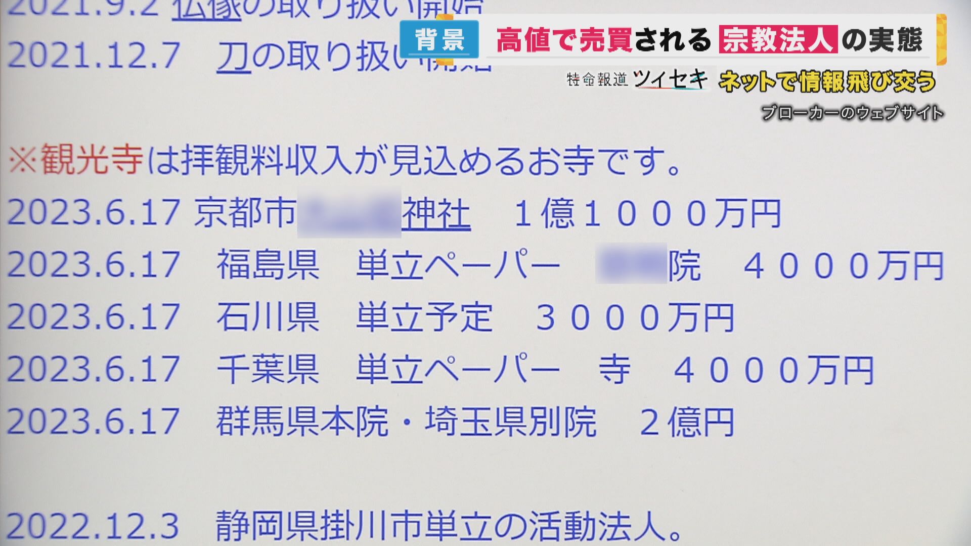 ![]() | 寺や神社が高値で“売り”に出されている!? 宗教法人の税制優遇などが背景に 「外国人でもOK」ブローカーに“裏事情”聞く 『母の墓』勝手に移設された檀家の“怒り” …山本氏が運営するウェブサイトには、数千万から億単位で、寺や神社の土地や宗教法人そのものが取引されています。 --Q:実際に売りに出されるのはどのような宗教なのでしょうか?… (出典:関西テレビ) |
