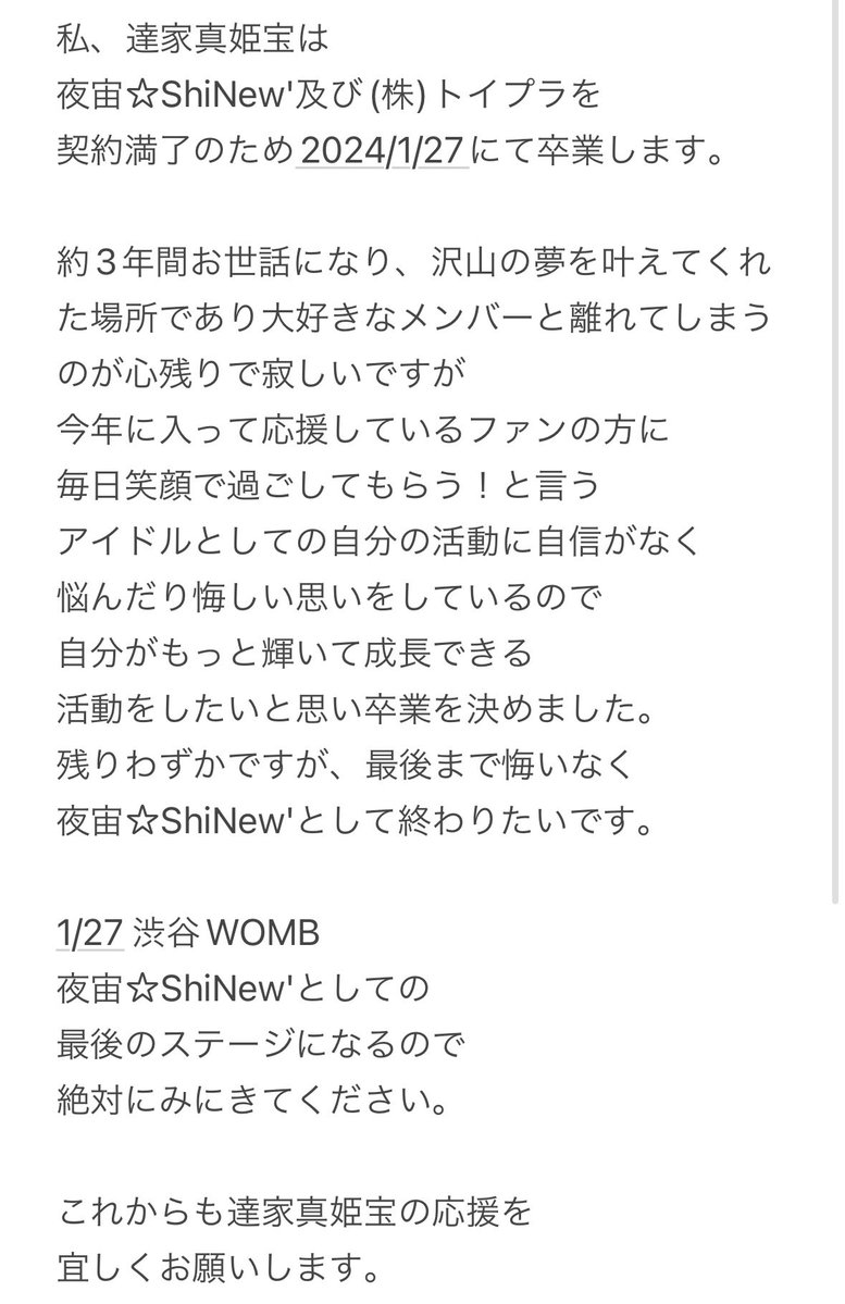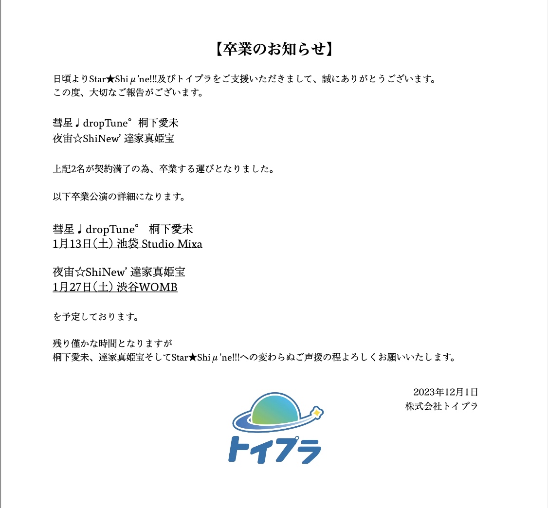 【桐下愛未 達家真姫宝 卒業のお知らせ】