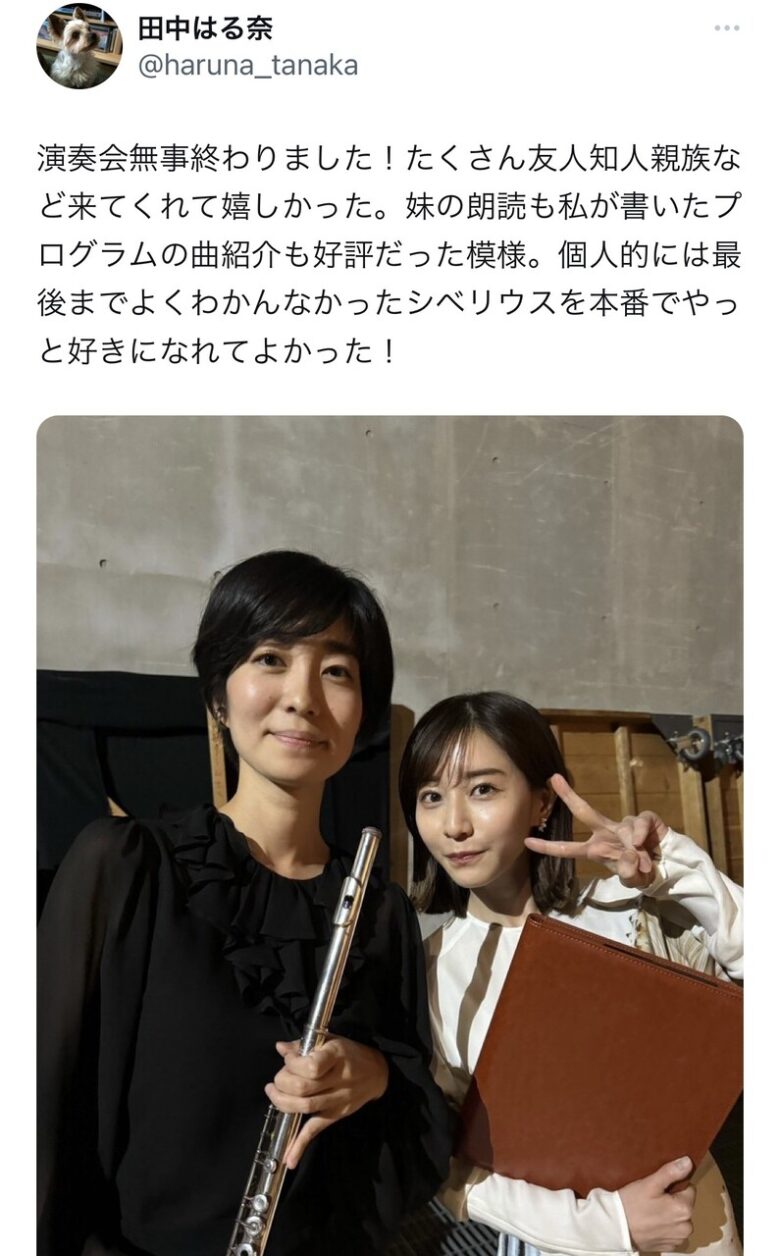 はる奈さんは「演奏会無事終わりました!たくさん友人知人親族など来てくれて嬉しかった」とつづり、田中みな実との写真を掲載。「妹の朗読も私が書いたプログラムの曲紹介も好評だった模様。個人的には最後までよくわかんなかったシベリウスを本番でやっと好きになれてよかった!」と投稿した。