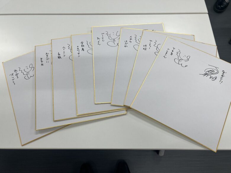 写真にはジョイマンの2人がサインを書いた色紙が机の上に8枚。それぞれ左上にある高木のサインには代表的な「ありがとう オリゴとう」や「下半身 じんましん」「サンキュー 地球」などさまざまなバリエーションのラップがしたためられていた。