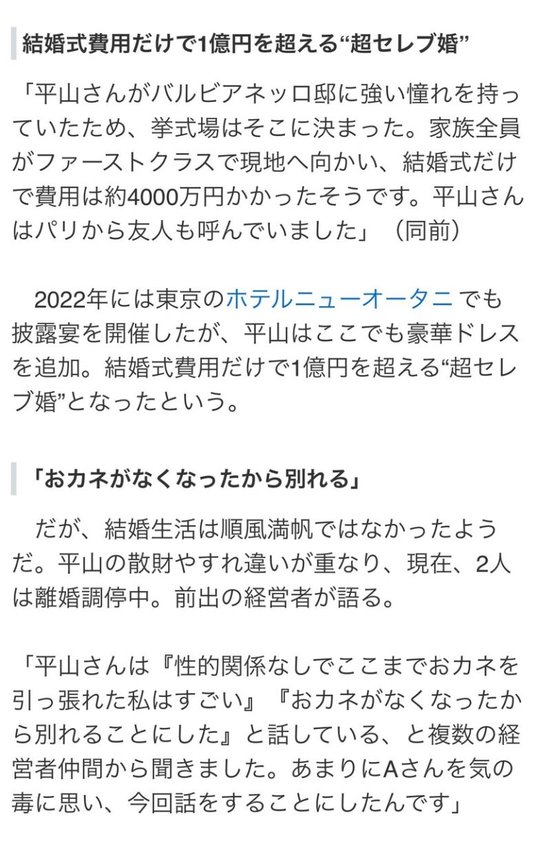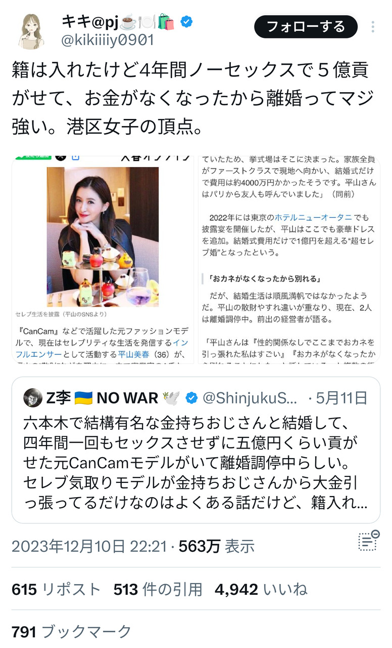 籍は入れたけど4年間ノーセックスで5億貢がせて、お金がなくなったから離婚ってマジ強い。港区女子の頂点。 https://t.co/oHY92DNAbv pic.twitter.com/i8m5IfmodN