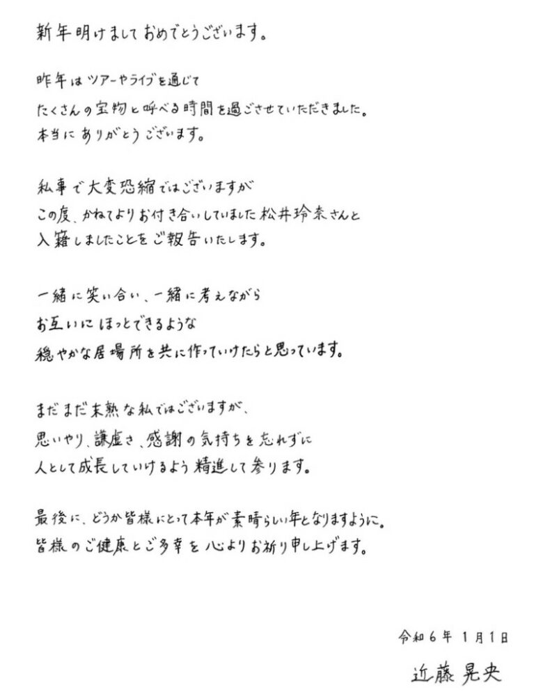 松井玲奈が近藤晃央と結婚 「一層精進していく所存です」とファンサイトで報告
