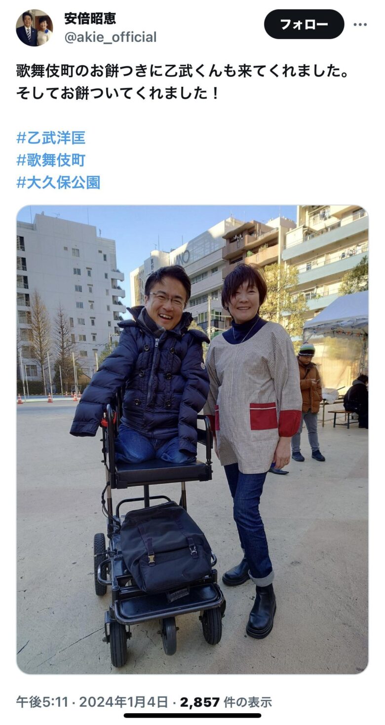 そしてお餅ついてくれました!#乙武洋匡#歌舞伎町#大久保公園 pic.twitter.com/EoqThEWfpg— 安倍昭恵 (@akie_official) January 4, 2024