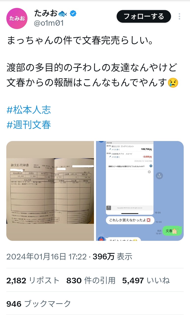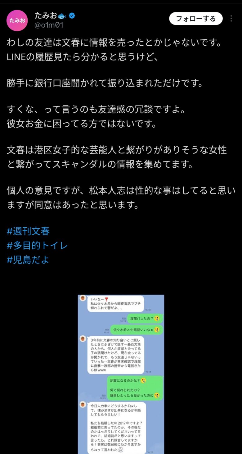 渡部の多目的の子わしの友達なんやけど文春からの報酬はこんなもんでやんす😢#松本人志#週刊文春 pic.twitter.com/DZD1lDZyXi