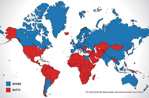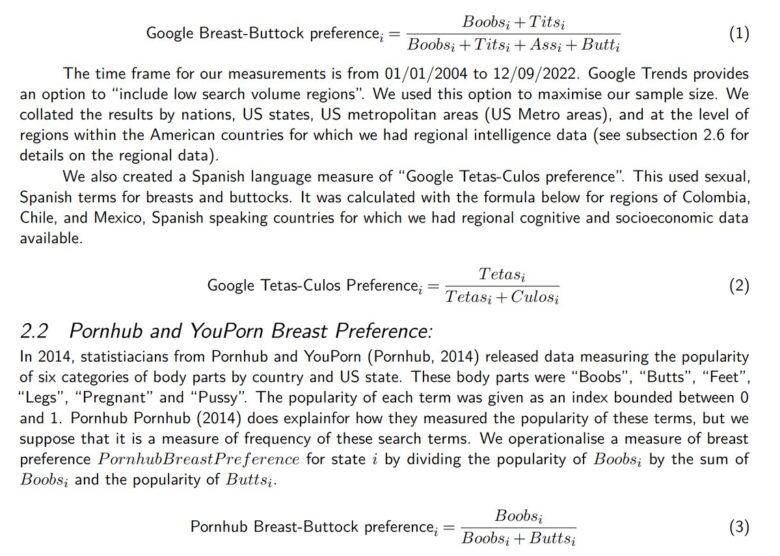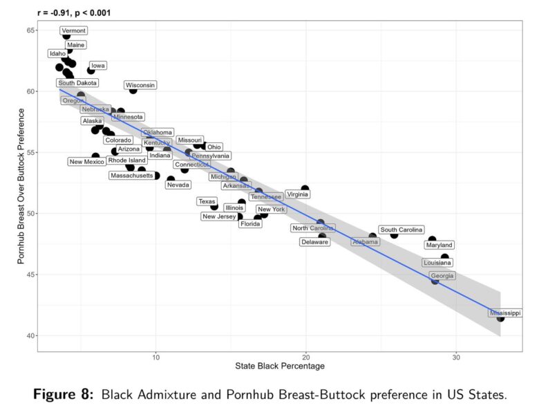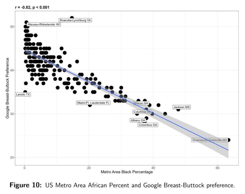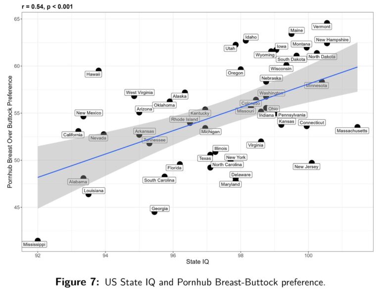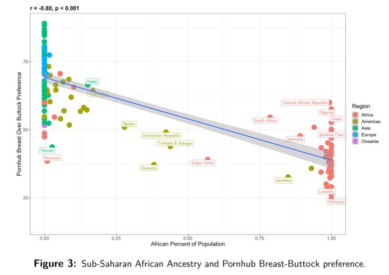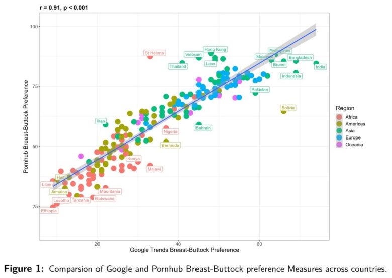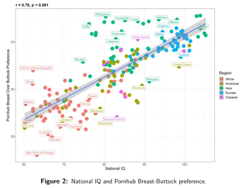 研究では、Google、Pornhub、YouPornでの乳房に関連する用語と臀部に関連する用語のインターネット検索の相対頻度をもとに、国および地方の嗜好と平均IQに関する調査を実施したという。その結果、アフリカに祖先を持つ人たちは尻派が多いというデータが出たという。これは住んでいる地域や使用している言語に関係なくその傾向が強いようだ。なお、乳房に対する関心が高い国は、全体的に見て知能が高いことを示す非常に強い相関関係があった模様。