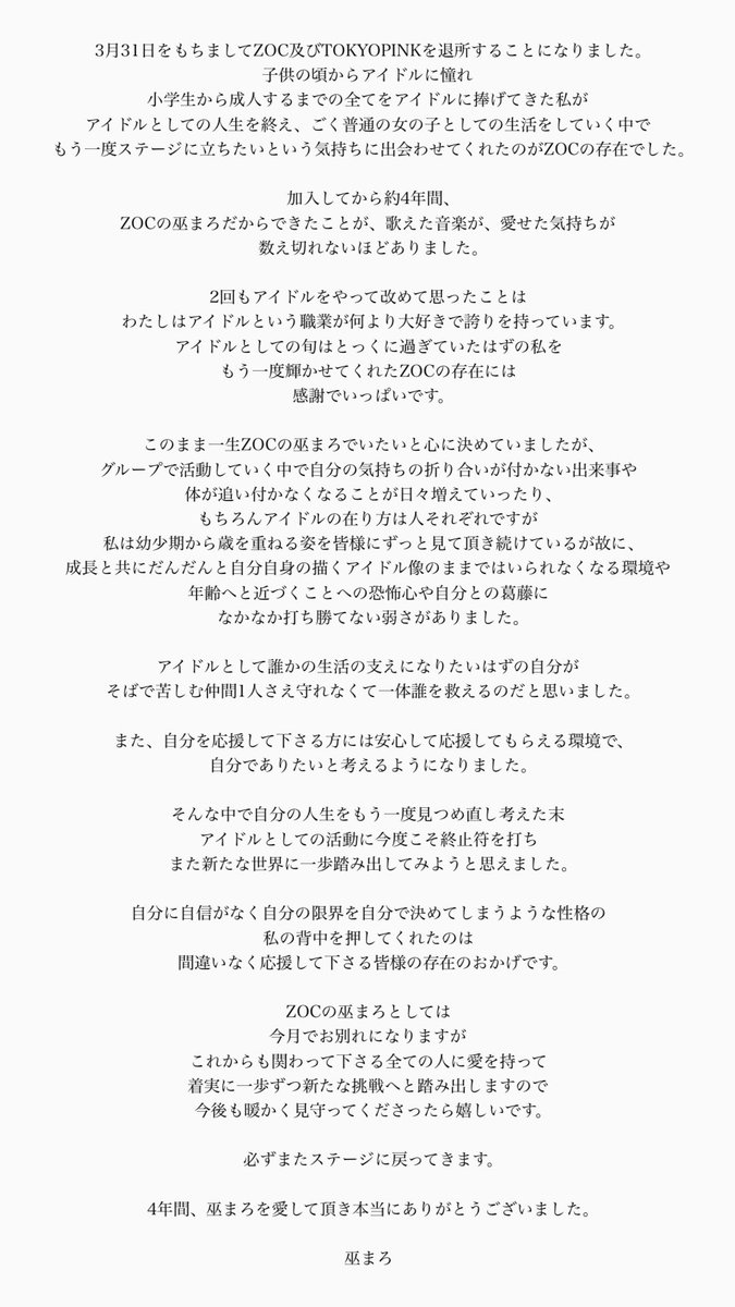 巫まろ「アイドルとしての活動に今度こそ終止符を打ち」 アイドル引退を宣言
