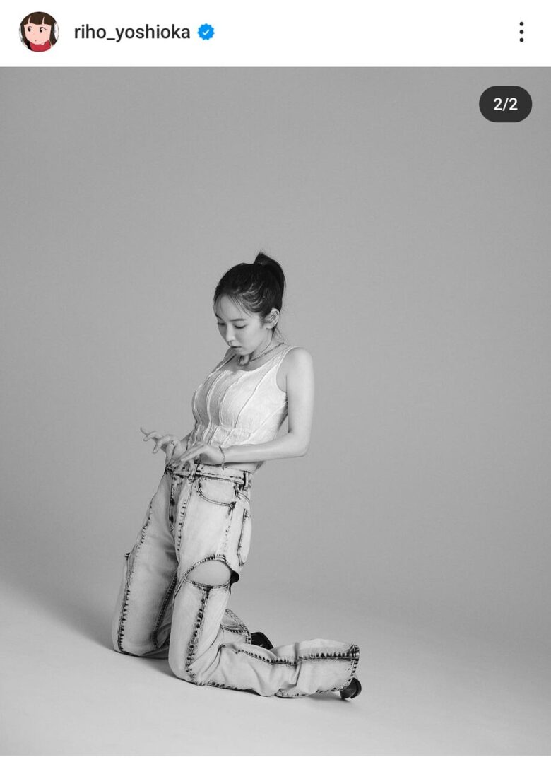 オフショットと思われる写真では、腰のあたりを肌見せした個性的なデザインのタイトなタンクトップに、太ももに切れ込みが入ったダメージデニム姿で、透明感と妖艶さを両立させた。