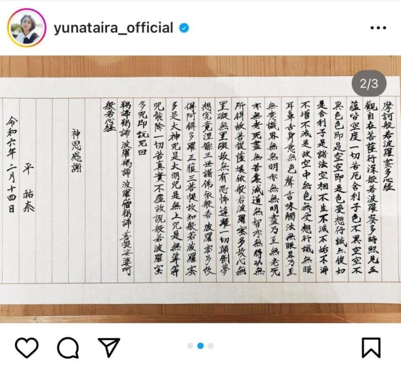 20行以上にわたり「摩訶般若波羅蜜多心経」などと書かれた毛筆の文字が整列。末尾の「平祐奈」の署名が繊細な美しさを放っている。コメント欄は「素晴らし筆使い」「感動ものです」「素敵な字」「凄すぎい!」「令和の神仏習合」と驚きの声を上げた。