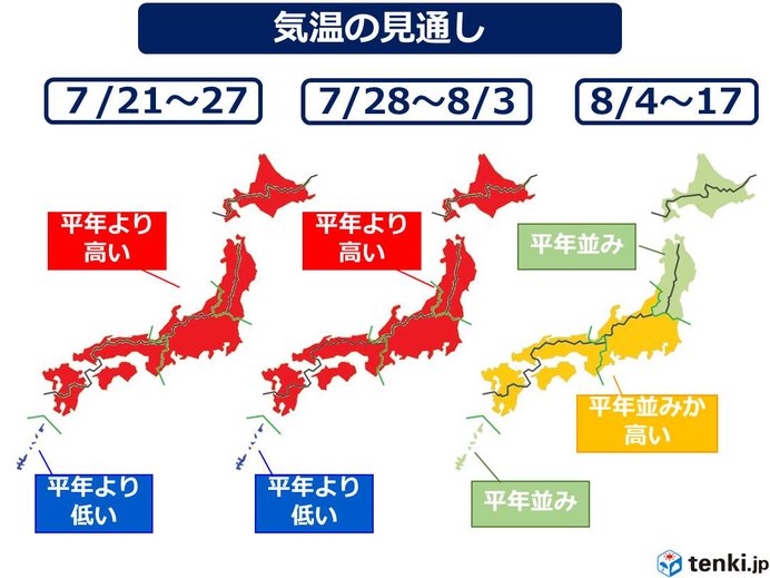 ![]() | 【1か月予報】例年以上の厳しい暑さに …間は、平年並みか多いでしょう。降水量は平年並みか少ない見込みです。 ■1か月予報(7月23日から8月22日までのまとめ) <気温の確率予想:低い・平年並み・高い>… (出典:日テレNEWS) |