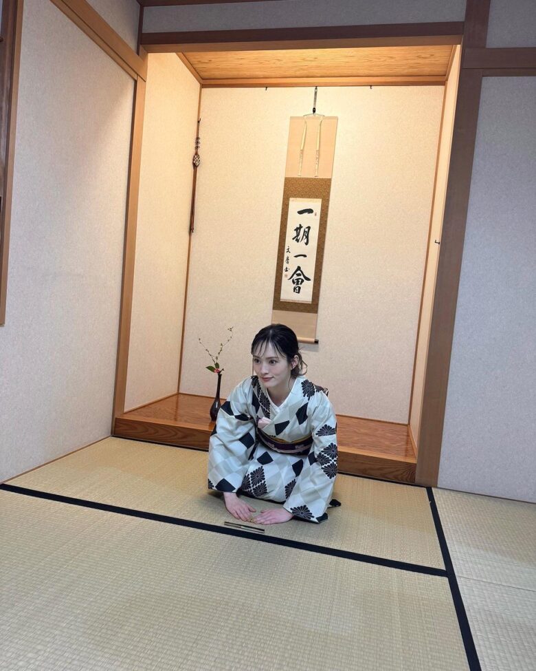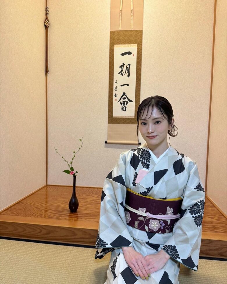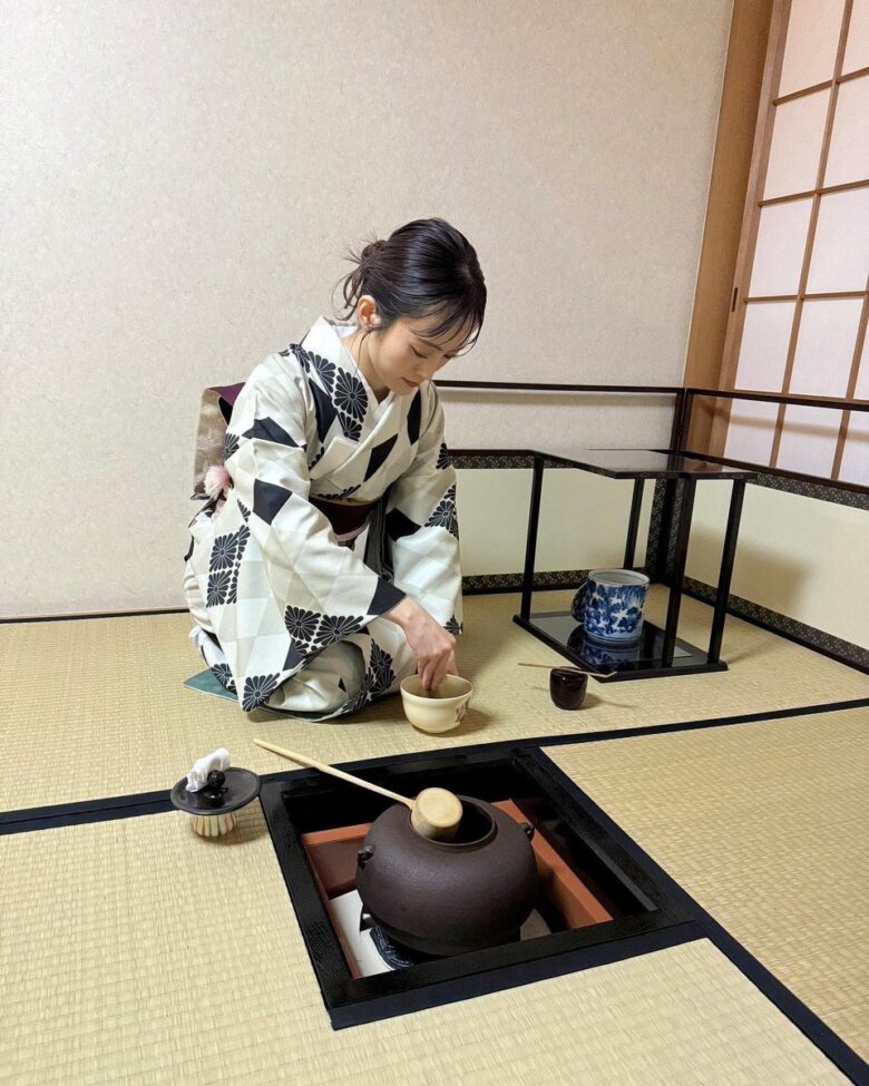 着物姿で茶道に臨んでいる様子を披露し、大きな反響を呼んでいる。