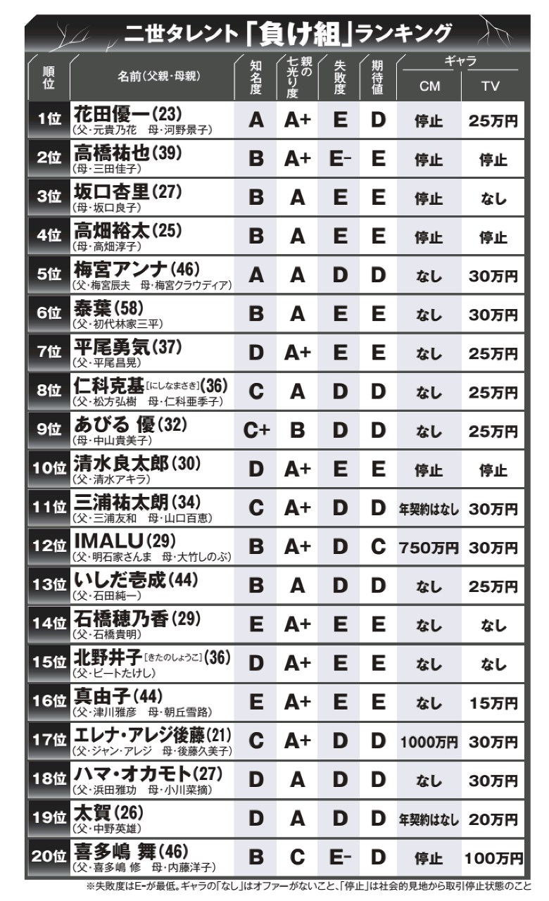 二世タレント負け組ランキング