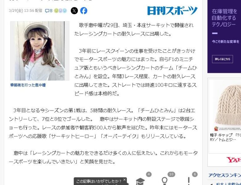 歌手恵中瞳が29日、埼玉・本庄サーキットで開催されたレーシングカートの耐久レースに