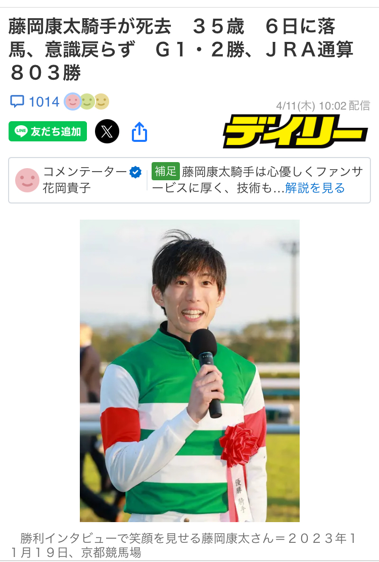藤岡康太騎手が死去 35歳 6日に落馬負傷