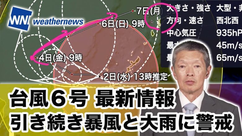| 【台風情報】大型で非常に強い台風6号 東に向きを変える見込み 週末以降九州に大きな影響のおそれも(2日午後6時現在) …大型で非常に強い台風6号は、進路によっては、週末以降、九州への影響が大きくなるおそれがあります。 大型で非常に強い台風6号は、2日午後6時には、沖縄… (出典:MRT宮崎放送) |