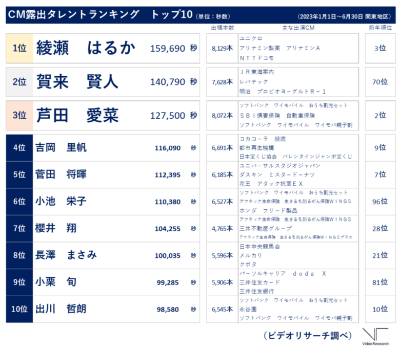 @sponichiannex23年上半期CM露出タレント1位は綾瀬はるか 起用社数1位は19社の川口春奈 それぞれの2位は… sponichi.co.jp/entertainment/…