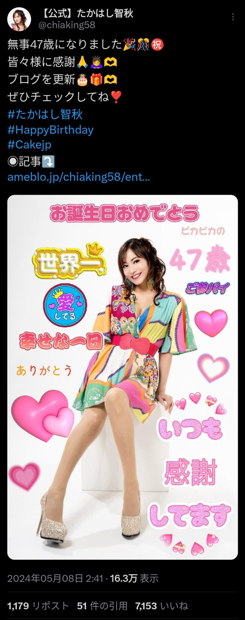 ◉記事⤵️https://t.co/WIYRv1m2h0 pic.twitter.com/b4pCvf95yG— 【公式】たかはし智秋 (@chiaking58) May 7, 2024